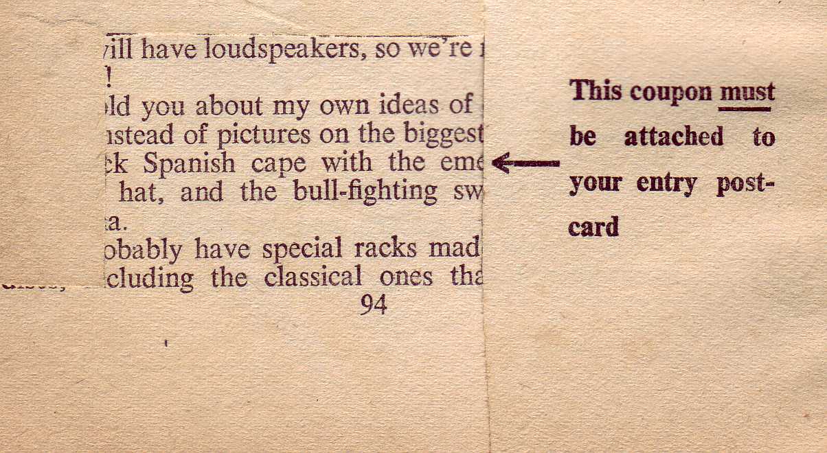 PS The final page in the book is devoted to a reader competition. If YOU want to win a portable record player, five long-playing records and the chance to meet Adam Faith, just tell us in 50 words (on a postcard, please) why you like the singer and his records, and return the coupon.