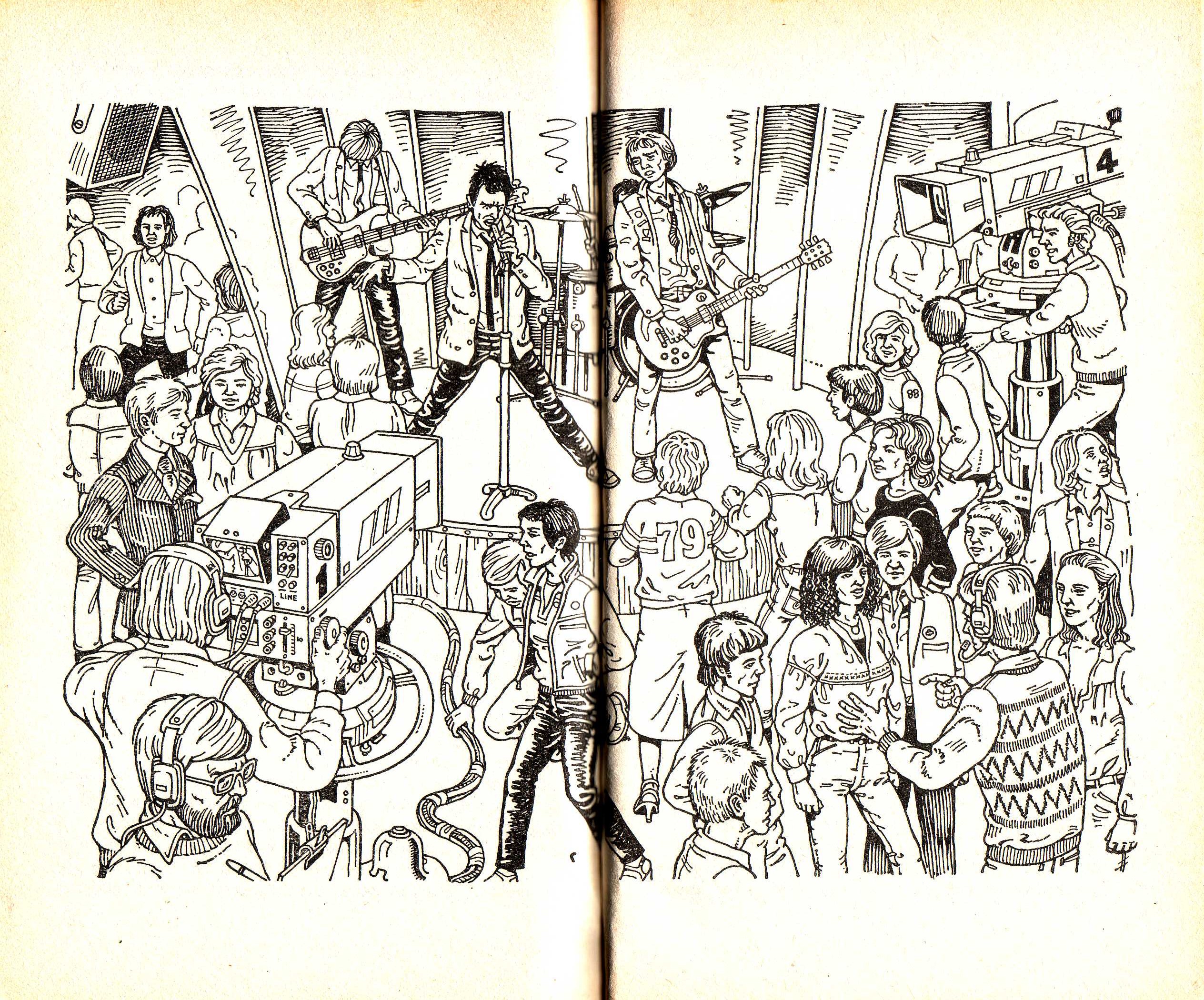 In contrast, Peter Powell’s book is a more focussed discussion about the workings of pop. This is pop as a business; witness the thorough glossary with its entries on ‘Faders’, ‘Merchandise’, ‘Plugger’ and ‘Royalties’. We learn too about the role of Promotions, Sales and A and R departments, the unpredictability of the hit record, of bands who concentrate on albums (Vangelis, Yes), and of bands who – inexplicably – achieve success in another country (“Flintlock, for example, are big stars in the Far East”). The book is illustrated with line drawings by one Dave Bowyer. After going misty-eyed over a picture of a record shop which actually contained records, I also found much to enjoy in the pinpoint sartorial accuracy of this imagined scene from Top of the Pops: