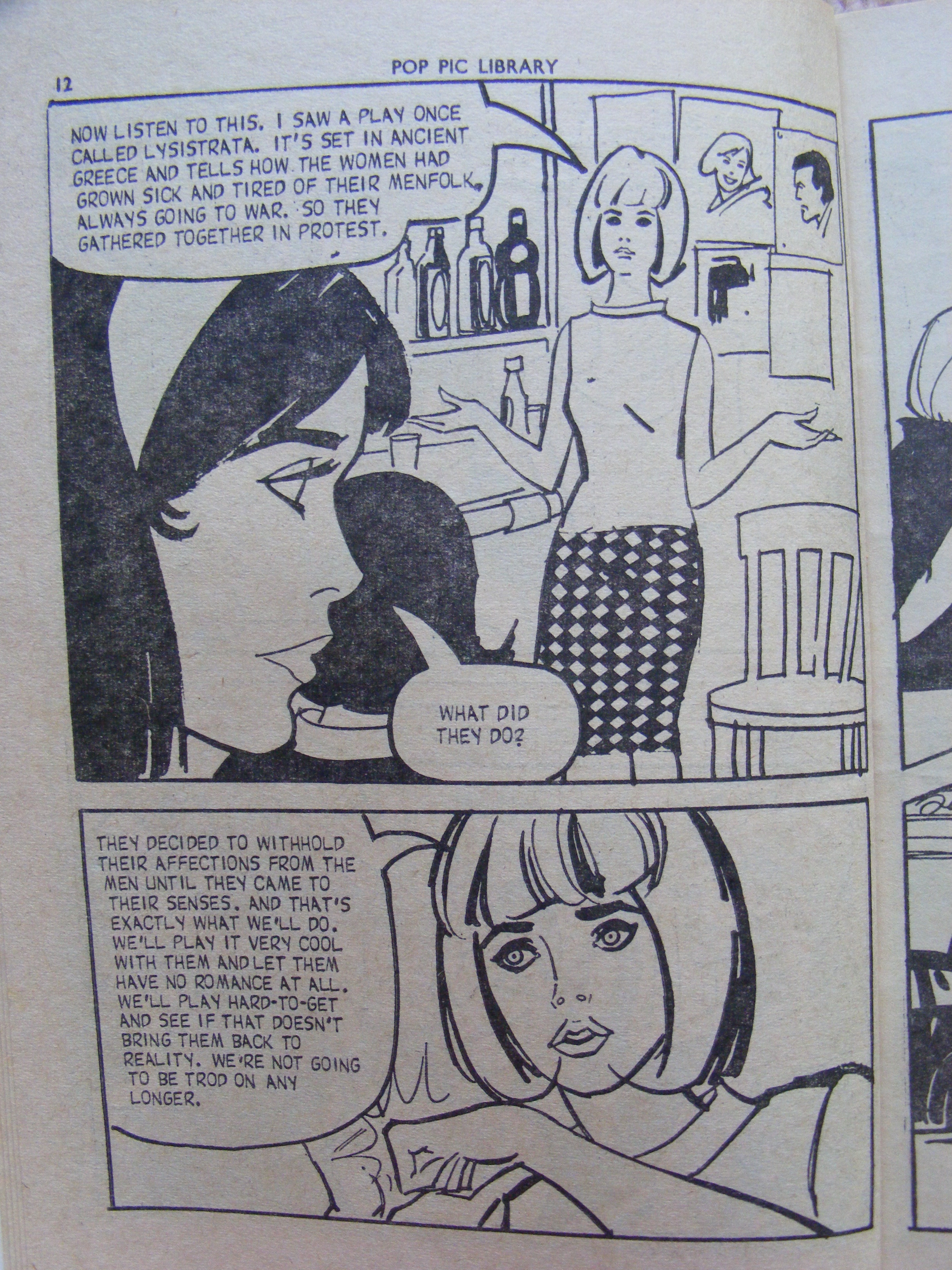 As a reflection of the times in which it was published, the comic comes into its own in its portrayal of young women. In ‘The Last Time’, Carol is good at her job and accordingly makes her own important contribution to the world of pop, even if the conclusion to her story is the predictable happy-ever-after one. The set-up of the story in issue 20, ‘As Tears Go By’, is anything but predictable. It opens with a group of girls marching on the local dance hall with banners proclaiming ‘DOWN WITH BEAT’ and ‘THE GUITARS MUST GO’. The problem is that their boyfriends all play in bands and can only think of music, which means that the girls feel like they’re getting a raw deal. The initial solution to this comes from the unlikely source of Aristophanes. Vickie, the protagonist, explains the plot to her friends.