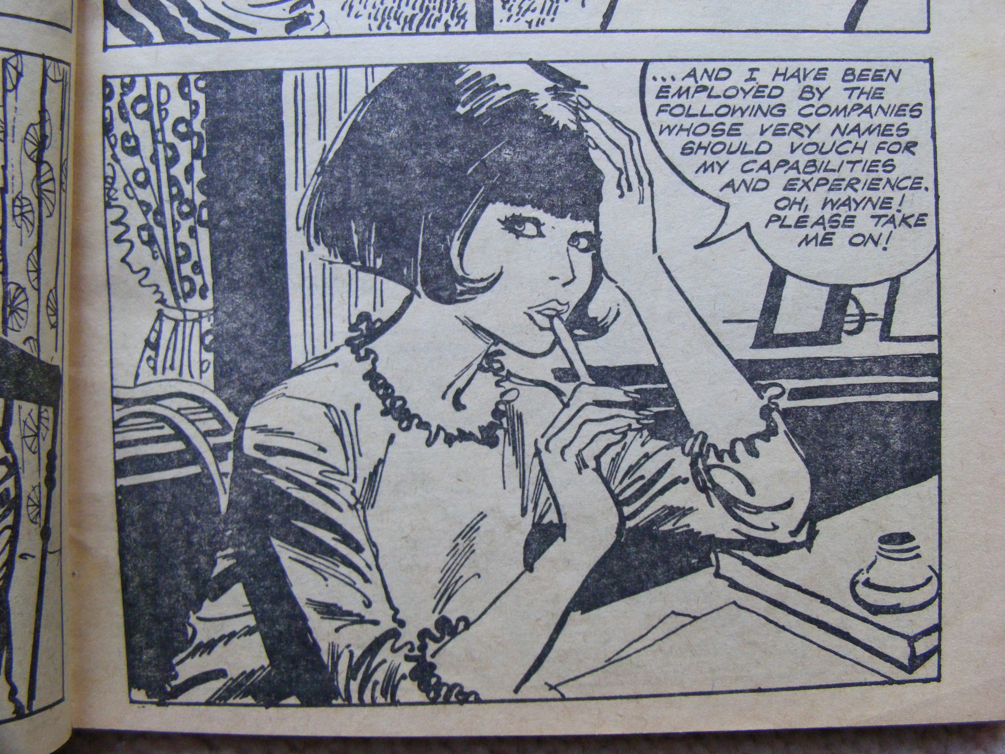 It’s both ludicrous and charming, which is pretty much how I’d sum up the other issues I’ve read. Whatever the specifics of individual stores, a constant preoccupation is the matter of people’s reaction to success, both one’s own and that of others. Wayne Gray arrogantly thinks he knows best about managing his own career and ends up being written out of the story. In issue 30, ‘Paperback Writer’, Melanie Regan is a singer enjoying her moment of fame, but at a rehearsal for a season on a variety bill at the London Coliseum, she’s the subject of this jealous tirade from another act: